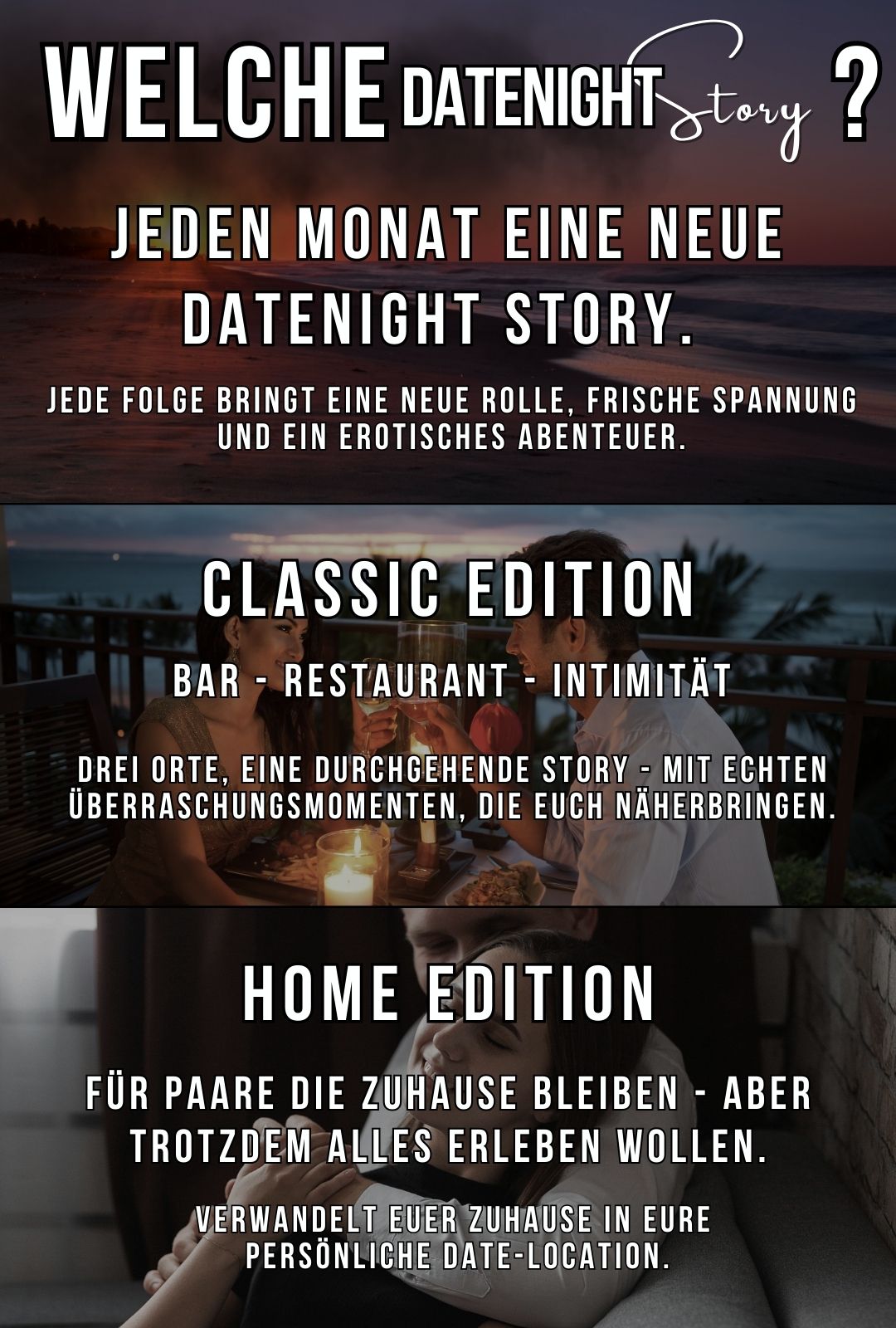 Ihr trefft euch in der Classic Edition an Orten, die ihr selbst bestimmt - Bar, Restaurant, Hotel oder bleibt , wie bei der Home Edition ganz Zuhause – und erlebt gemeinsam eine geführte Geschichte, die flirtet, überrascht und verbindet.